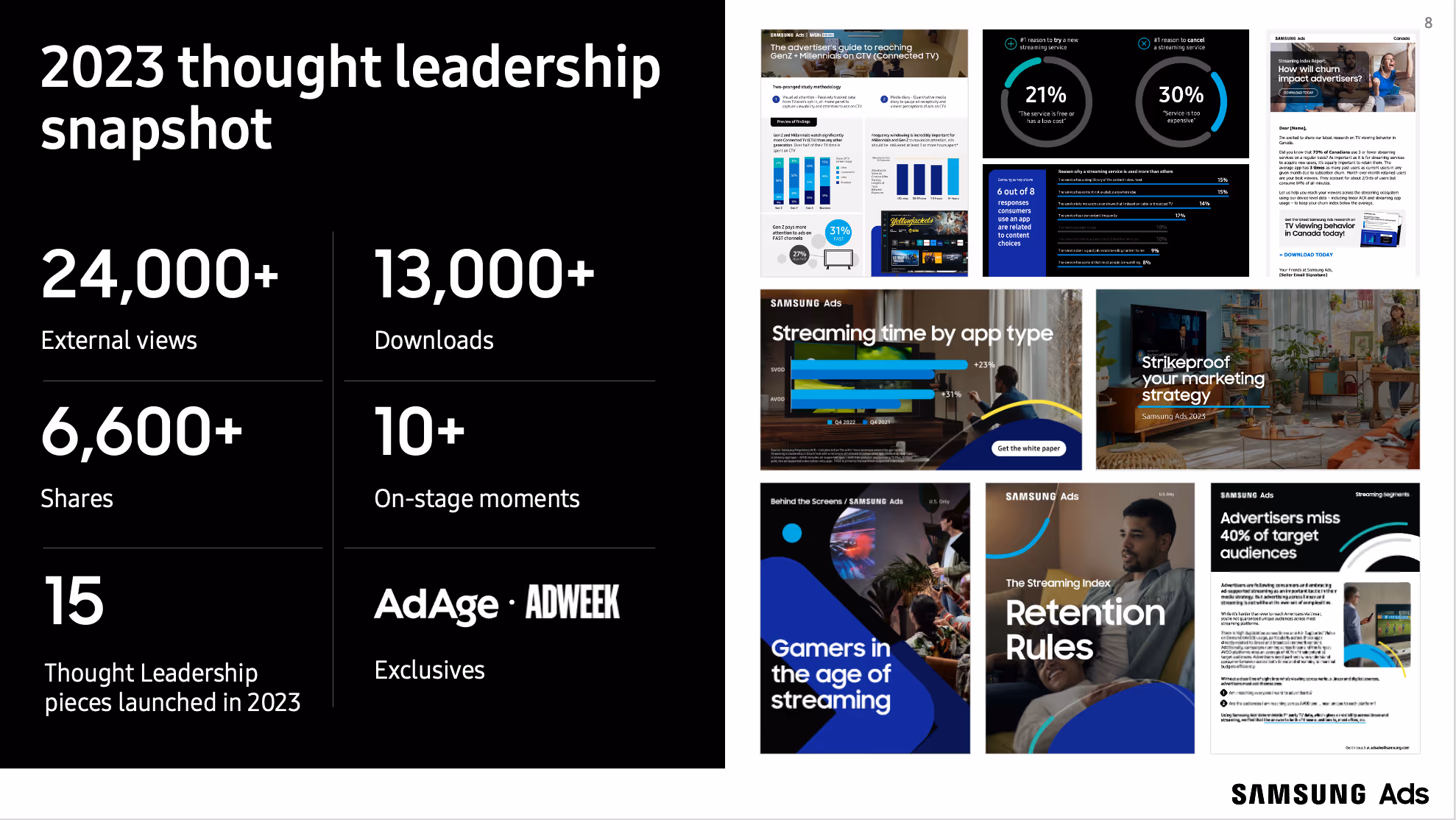 In May of 2022 we brought the Samsung Ads Global Marketing North America Team together for a very special summer workshop. It was the first time we had the whole team in the same room in nearly two years due to the pandemic, and in my role as Creative Director and Head of Global Creative Services, I was asked to have my team create a video to set the tone and kick off festivities. We decided there was no better way to do this than to celebrate all the things we had created and accomplished so far that year, and this video is a great sampling of our work and how great creative impacts the business.